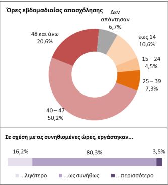 Ένα εύρημα που προβληματίζει από τις έρευνες εργατικού δυναμικού της ΕΛΣΤΑΤ είναι η αυξανόμενη εντατικοποίηση της εργασίας με «ξεχείλωμα» του ωραρίου. Συγκεκριμένα, πάνω από τους μισούς (50,2%), εργάστηκαν από 40 ως και 47 ώρες, ενώ ένα 20,6% εργάστηκε από 48 ώρες και πάνω. Ουσιαστικά, από το 70,6% των εργαζομένων στην Ελλάδα απάντησε ότι εργάστηκε πάνω από 40 ώρες την εβδομάδα.