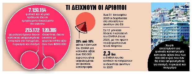 Κερδισμένοι του ΕΝΦΙΑ του 2025 θα είναι πάνω από 200.000 ιδιοκτήτες κατοικιών φορολογητέας αξίας έως 500.000 ευρώ οι οποίες είναι ασφαλισμένες για σεισμό, πυρκαγιά και πλημμύρα. Για τους φορολογούμενους αυτούς η έκπτωση στον ΕΝΦΙΑ διπλασιάζεται και ανεβαίνει στο 20% από 10% που εφαρμόστηκε στο φετινό εκκαθαριστικό του φόρου ακινήτων. Για παράδειγμα, ιδιοκτήτης με ΕΝΦΙΑ ύψους 400 ευρώ, εάν έχει ασφαλίσει τη κατοικία του για ολόκληρο το έτος, θα πληρώσει το 2025 φόρο 320 ευρώ. Δηλαδή θα έχει ετήσιο όφελος 80 ευρώ από 40 ευρώ που ήταν η έκπτωση στον φετινό λογαριασμό.