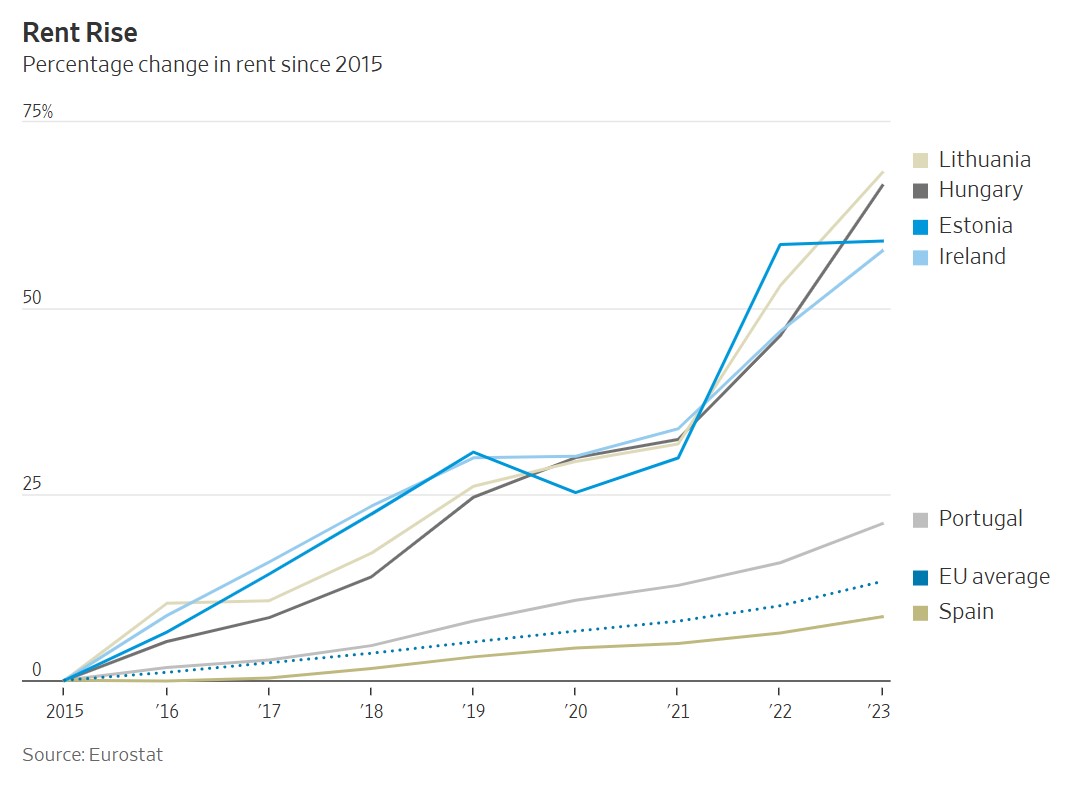Ορισμένες από τις πιο απότομες αυξήσεις των ενοικίων σημειώθηκαν στην κεντρική και ανατολική Ευρώπη. Στην Ουγγαρία και τη Λιθουανία, τα ενοίκια αυξήθηκαν περισσότερο από 60% από το 2015 έως το 2023, σύμφωνα με τη Eurostat. Και σε καθεμία από αυτές τις χώρες, οι τιμές των κατοικιών υπερδιπλασιάστηκαν κατά την ίδια περίοδο.