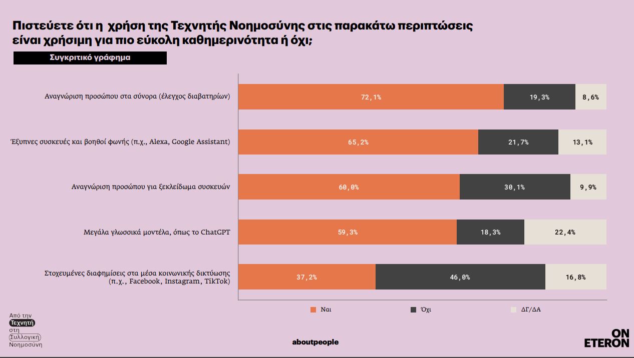 Τέλος, η έρευνα εξετάζει τη χρησιμότητα της ΤΝ, σε μία σειρά λειτουργιών. Ειδικότερα, το 60% των συμμετεχόντων πιστεύει ότι η αναγνώριση προσώπου για το ξεκλείδωμα συσκευών είναι χρήσιμη, ενώ το 30,1% διαφωνεί. Ακόμη μεγαλύτερη αποδοχή καταγράφεται για την αναγνώριση προσώπου στα σύνορα κατά τον έλεγχο διαβατηρίων, με το 72,1% να τη θεωρεί χρήσιμη και το 19,3% όχι.