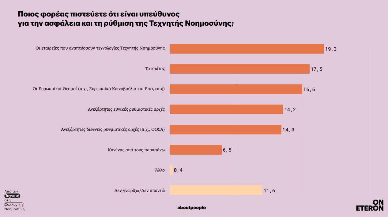 Συγκεκριμένα, οι εταιρείες που αναπτύσσουν τεχνολογίες τεχνητής νοημοσύνης θεωρούνται ο κύριος υπεύθυνος για την τήρηση της ασφάλειας με ποσοστό 19,3%. Ακολουθούν το κράτος (17,5%), οι ευρωπαϊκοί θεσμοί όπως το Ευρωπαϊκό Κοινοβούλιο και η Κομισιόν (16,6%), οι ανεξάρτητες εθνικές ρυθμιστικές αρχές (14,2%) και οι ανεξάρτητες διεθνείς ρυθμιστικές αρχές, όπως ο ΟΟΣΑ (14%).