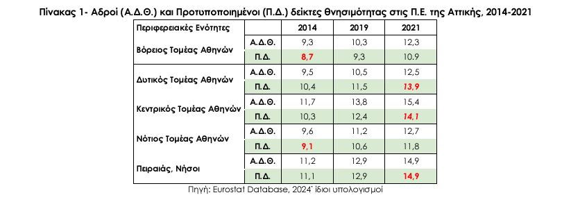 Οι προτυποποιημένοι ειδικότερα δείκτες του 2014, 2019 και 2021, που δεν επηρεάζονται από την διαφοροποιημένη κατανομή του πληθυσμού των Π.Ε της Αττικής ανά ηλικία, δείχνουν έναν σαφή διαχωρισμό, μεταξύ Βορείου και Νοτίου Τομέα Αθηνών, από την μια μεριά, και των λοιπών ενοτήτων που χαρακτηρίζονται από υψηλότερη θνησιμότητα. Πρόσφατες δε δημοσιεύσεις, που αναφέρονται στην περίοδο της πανδημίας, αφήνουν να διαφανεί ότι ο Covid-19 ανέδειξε τις ανισότητες και στον χώρο της υγείας, πλήττοντας κυρίως τους κοινωνικά και οικονομικά ασθενέστερους.