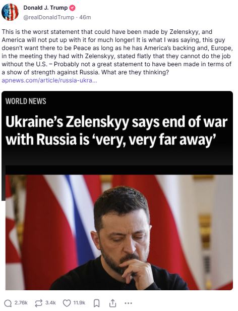 Ο πρόεδρος των ΗΠΑ Ντόναλντ Τραμπ καταδίκασε, στο δικό του κοινωνικό δίκτυο Truth Social, τις δηλώσεις Ζελένσκι. Ανέφερε πως οι ΗΠΑ δεν θα ανεχτούν πολύ ακόμα αντίστοιχη στάση από τον πρόεδρο της Ουκρανίας.