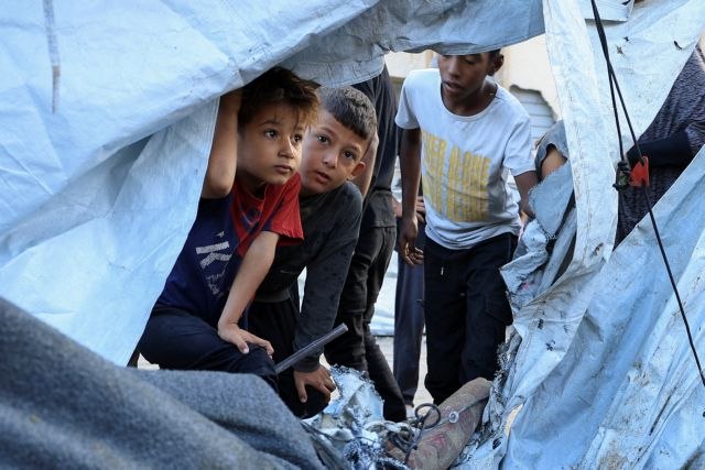 Οι ισραηλινές ένοπλες δυνάμεις ισοπέδωσαν χθες Παρασκευή μεγάλη πολυκατοικία στην πόλη της Γάζας, όπου το Ισραήλ ετοιμάζεται να εξαπολύσει μείζονα επίθεση, την 700ή ημέρα του πολέμου με το παλαιστινιακό ισλαμιστικό κίνημα Χαμάς (στη φωτογραφία του Reuters/Dawoud Abu Alkas, επάνω, μικροί Παλαιστίνιοι κοιτούν μέσα από τη σκηνή τους στην πόλη της Γάζας τους βομβαρδισμούς του Ισραήλ).