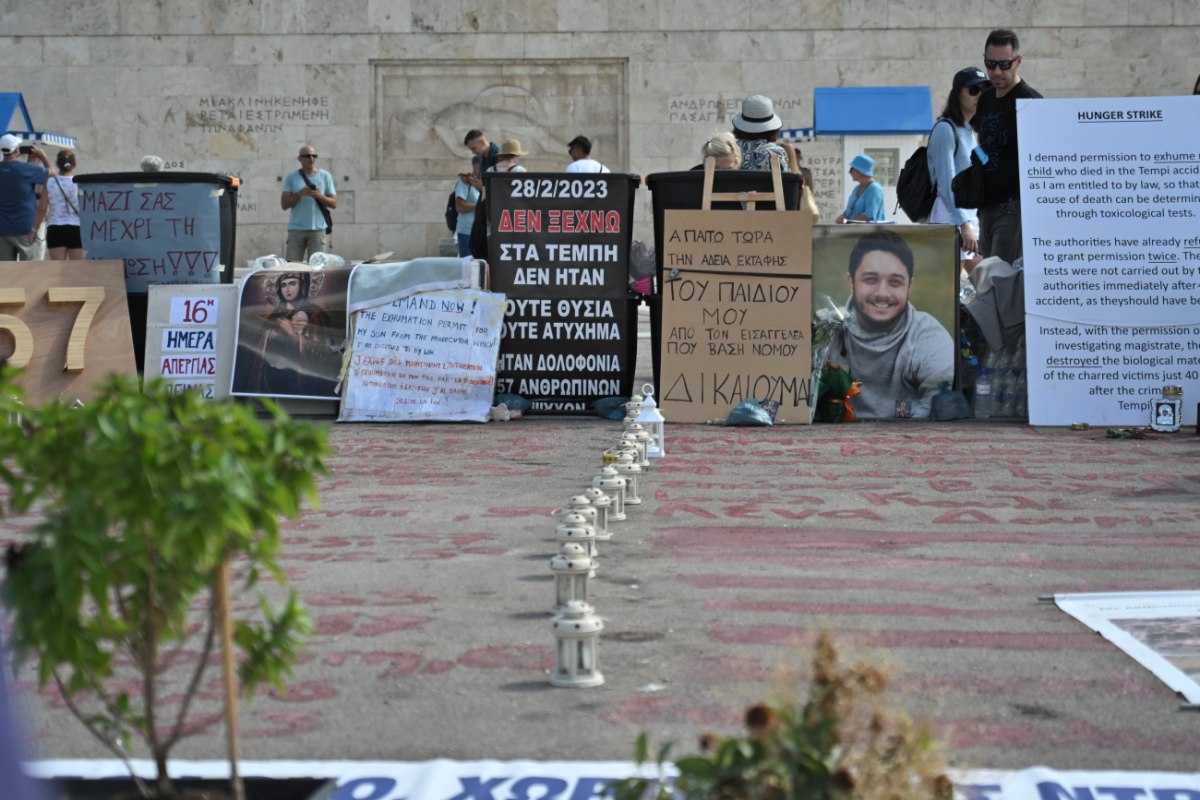 Στην πλατεία Συντάγματος, μπροστά από τη Βουλή όπου είναι γραμμένα τα ονόματα των 57 θυμάτων στα Τέμπη, εξακολουθεί να βρίσκεται ο Πάνος Ρούτσι, πατέρας του αδικοχαμένου Ντένις Ρούτσι, συνεχίζοντας την απεργία πείνας για 17η ημέρα.