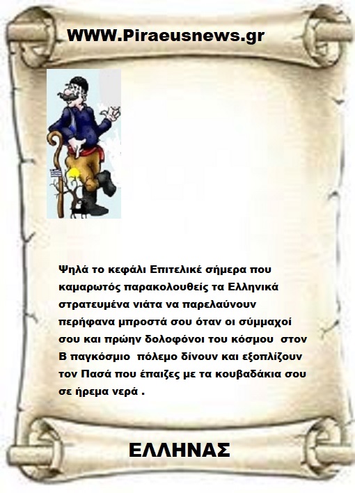• Ψηλά το κεφάλι Επιτελικέ σήμερα που καμαρωτός παρακολουθείς τα Ελληνικά στρατευμένα νιάτα να παρελαύνουν περήφανα μπροστά σου όταν οι σύμμαχοί σου και πρώην δολοφόνοι του κόσμου  στον Β παγκόσμιο  πόλεμο δίνουν και εξοπλίζουν τον Πασά που έπαιζες με τα κουβαδάκια σου σε ήρεμα νερά .