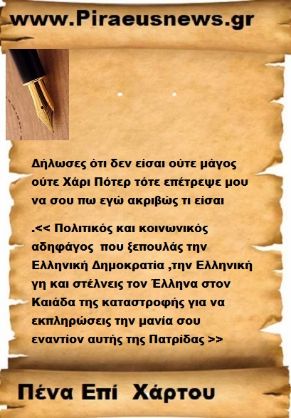 • Δήλωσες ότι δεν είσαι ούτε μάγος  ούτε Χάρι Πότερ τότε επέτρεψε μου να σου πω εγώ ακριβώς τι είσαι .<< Πολιτικός και κοινωνικός αδηφάγος  που ξεπουλάς την Ελληνική Δημοκρατία ,την Ελληνική γη και στέλνεις τον Έλληνα στον Καιάδα της καταστροφής για να εκπληρώσεις την μανία σου εναντίον αυτής της Πατρίδας >>