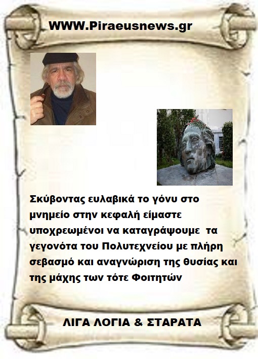 Η κατεστραμμένη πύλη του ιδρύματος, την οποία κατέρριψε το άρμα μάχης στις 17 Νοεμβρίου του 1973, και το γλυπτό «Προς τιμήν των θυμάτων» του Μέμου Μακρή.