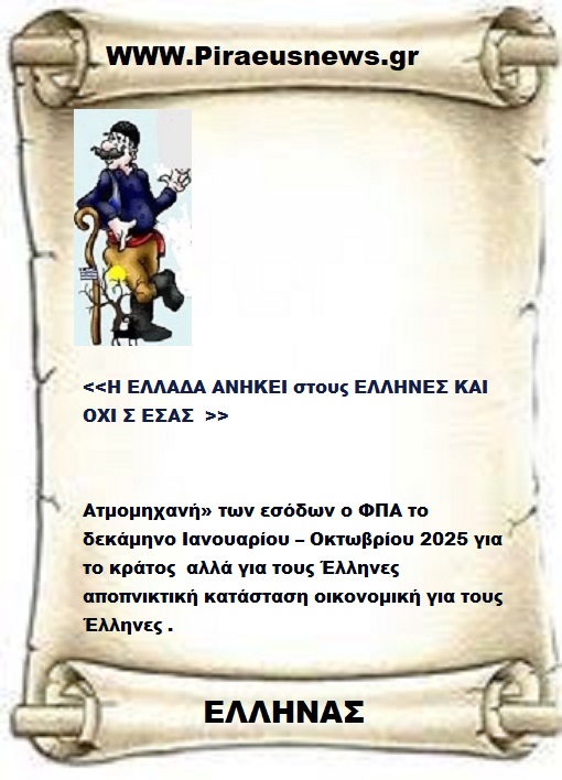 Ατμομηχανή» των εσόδων ο ΦΠΑ το δεκάμηνο Ιανουαρίου – Οκτωβρίου 2025 για το κράτος  αλλά για τους Έλληνες αποπνικτική κατάσταση οικονομική για τους Έλληνες .