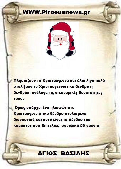 Πλησιάζουν τα Χριστούγεννα και όλοι λίγο πολύ στολίζουν το Χριστουγεννιάτικο δένδρο η δενδράκι ανάλογα τις οικονομικές δυνατότητες τους . Όμως υπάρχει ένα ηλιοφώτιστο Χριστουγεννιάτικο δένδρο στολισμένο διαχρονικά και αυτό είναι το Δένδρο του κόμματος σου Επιτελικέ συνολικά 50 χρόνια