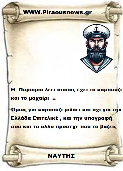 • Η  Παροιμία λέει όποιος έχει το καρπούζι και το μαχαίρι  ..  όμως για καρπούζι μιλάει και όχι για την Ελλάδα Επιτελικέ , και την υπογραφή σου και το άλλο πρόσεχε που το βάζεις
