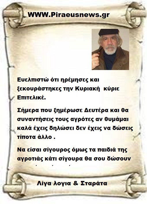 Ευελπιστώ ότι ηρέμησες και ξεκουράστηκες την Κυριακή  κύριε Επιτελικέ. Σήμερα που ξημέρωσε Δευτέρα και θα συναντήσεις τους αγρότες αν θυμάμαι καλά έχεις δηλώσει δεν έχεις να δώσεις τίποτα άλλο . Να είσαι σίγουρος όμως τα παιδιά της αγροτιάς κάτι σίγουρα θα σου δώσουν γι αυτό να είσαι σίγουρος .