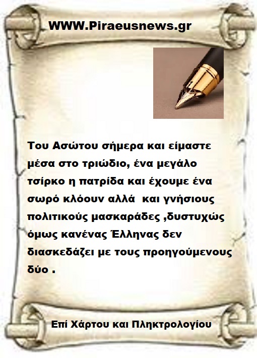 Του Ασώτου σήμερα και είμαστε μέσα στο τριώδιο, ένα μεγάλο τσίρκο η πατρίδα και έχουμε ένα σωρό κλόουν αλλά  και γνήσιους πολιτικούς μασκαράδες ,δυστυχώς όμως κανένας Έλληνας δεν διασκεδάζει με τους προηγούμενους δύο .