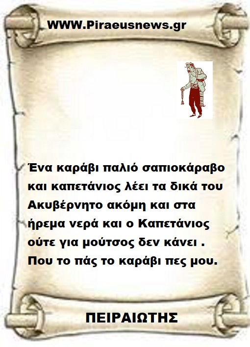 Ένα καράβι παλιό σαπιοκάραβο και καπετάνιος λέει τα δικά του Ακυβέρνητο ακόμη και στα ήρεμα νερά και ο Καπετάνιος ούτε για μούτσος δεν κάνει . Που το πάς το καράβι πες μου.