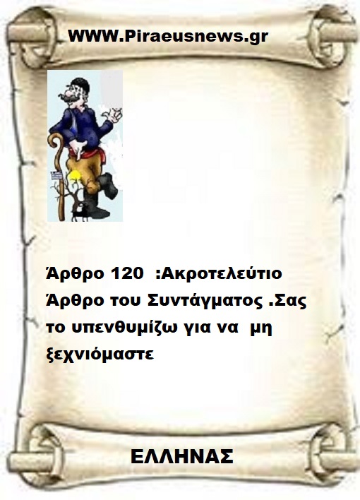 Τώρα θα μου πείτε γιατί ξεκινάω αυτές τις λίγες γραμμές με το τελευταίο άρθρο του Συντάγματος το κάνω για να θυμίσω σ όλους σας τι λέει το τελευταίο άρθρο του Συντάγματος για να σας θυμίσω τις υποχρεώσεις όλων σας Κυβερνόντων και Λαού .
