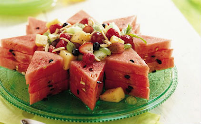 Σε ξύλο κοπής κόβουμε σε χοντρά κομμάτια το καρπούζι μαζί με το πεπόνι και το ρίχνουμε σε μια σαλατιέρα, ψιλοκόβουμε τα φυλλαράκια μέντας και τα ρίχνουμε μέσα στη σαλατιέρα.