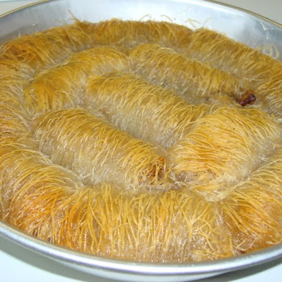 Επαναλαμβάνετε την ίδια διαδικασία μέχρι να ολοκληρωθούν τα υλικά και μεταφέρετε τα κανταΐφια, το ένα δίπλα στο άλλο, σε βουτυρωμένο ταψί.