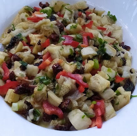 Ψήνουμε τις μελιτζάνες στο φούρνο ή σε ηλεκτρική ψηστιέρα, όπως είναι καυτές τις ξεφλουδίζουμε και τις κόβουμε σε κύβους τις τοποθετούμε μέσα σε ένα μεγάλο μπολ, κόβουμε ένα ψιλοκομμένο κρεμμυδάκι μαζί με την πρασινάδα του ρίχνουμε τον μαϊντανό, ψιλοκόβουμε την πιπεριά τις λιαστές ντομάτες τριμμένο σκόρδο στον τρίφτη ρίχνουμε λίγο μπαλσάμικο και λίγο ξύδι κανονικό ελαιόλαδο αλάτι ανακατεύουμε και δοκιμάζουμε.. στην συνέχεια τη βάζουμε στο ψυγείο να παγώσει και σερβίρουμε παγωμένη… Η έντονη μυρωδιά του σκόρδου θα βγει την επόμενη μέρα στο ψυγείο γι αυτό μην το παρακάνετε..!!