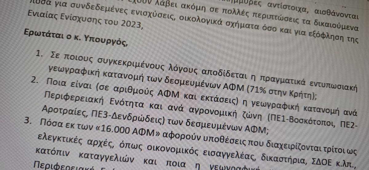 Χαρακτηριστικά, σε ερώτηση στις 25/6 αναφέρονται «η πραγματικά εντυπωσιακή γεωγραφική κατανομή των δεσμευμένων ΑΦΜ (71% στην Κρήτη)» και οι πλημμελείς ή ανύπαρκτοι έλεγχοι, ενώ διερωτάται η ηγεσία του ΥΠΑΑΤ πόσα από τα 16.000 δεσμευμένα ΑΦΜ έχουν φτάσει στον οικονομικό εισαγγελία, τα δικαστήρια και τον ΣΔΟΕ.