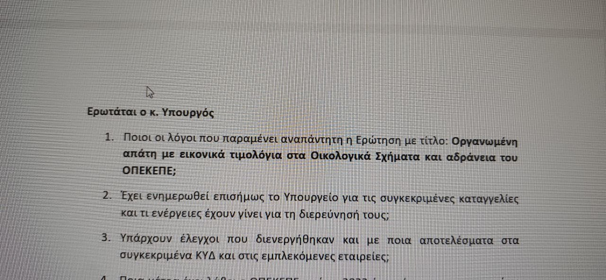 Τέσσερις είναι οι σχετικές αναπάντητες ερωτήσεις μόνο στο δεύτερο μισό του Ιουνίου του 2025. Με την πρώτη εξ αυτών στις 17 Ιουνίου ζητείται να κομιστεί στη Βουλή το ξεχασμένο Action Plan για την αναδιάρθρωση του ΟΠΕΚΕΠΕ που είχε εξαγγελθεί από το 2023, καθώς επίσης και οι παρατηρήσεις της Ευρωπαϊκής Επιτροπής κατά την πορεία υλοποίησής του. Συμπτωματικά, αργότερα την ίδια μέρα, η Ευρωπαϊκή Επιτροπή θα καταλογίσει πρόστιμο-μαμούθ 415 εκατομμυρίων ευρώ στο ελληνικό Δημόσιο για κακοδιαχείριση και ελλιπείς ελέγχους των επιδοτήσεων. Δεν είναι σαφές σε τι βαθμό φταίει αυτή η σύμπτωση που το ερώτημα μένει αναπάντητο.