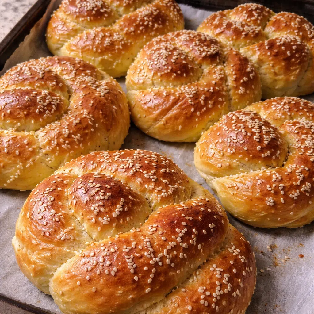 Αλείφουμε απαλά με γάλα, πασπαλίζουμε με σουσάμι και ψήνουμε σε προθερμασμένο φούρνο στους 150°C στον αέρα για περίπου 25 έως 30 λεπτά, μέχρι να πάρουν ωραίο χρυσαφένιο χρώμα.