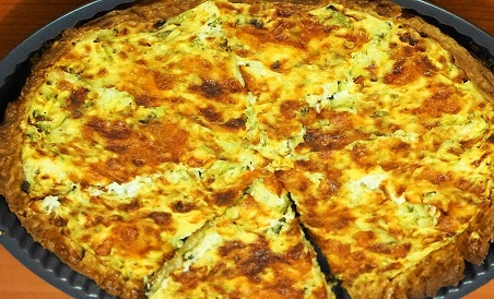- Αδειάζουμε το μείγμα στην ταρτιέρα με τη σφολιάτα, τη στρώνουμε καλά και πασπαλίζουμε με λίγο τριμμένο τυρί γκούντα (50 γραμμάρια περίπου).