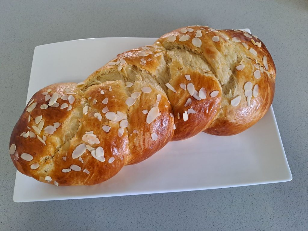 Αλείφουμε με τον κρόκο αυγού, πασπαλίζουμε με τα αμύγδαλα και ψήνουμε σε προθερμασμένο φούρνο στους 180°C με αντιστάσεις για περίπου 20 λεπτά, μέχρι να πάρουν ωραίο χρυσαφένιο χρώμα.
