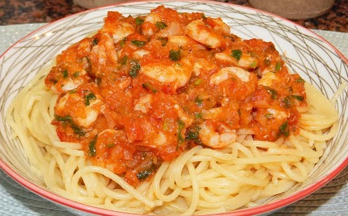 Μακαρόνια με γαρίδες σε σάλτσα τομάτας